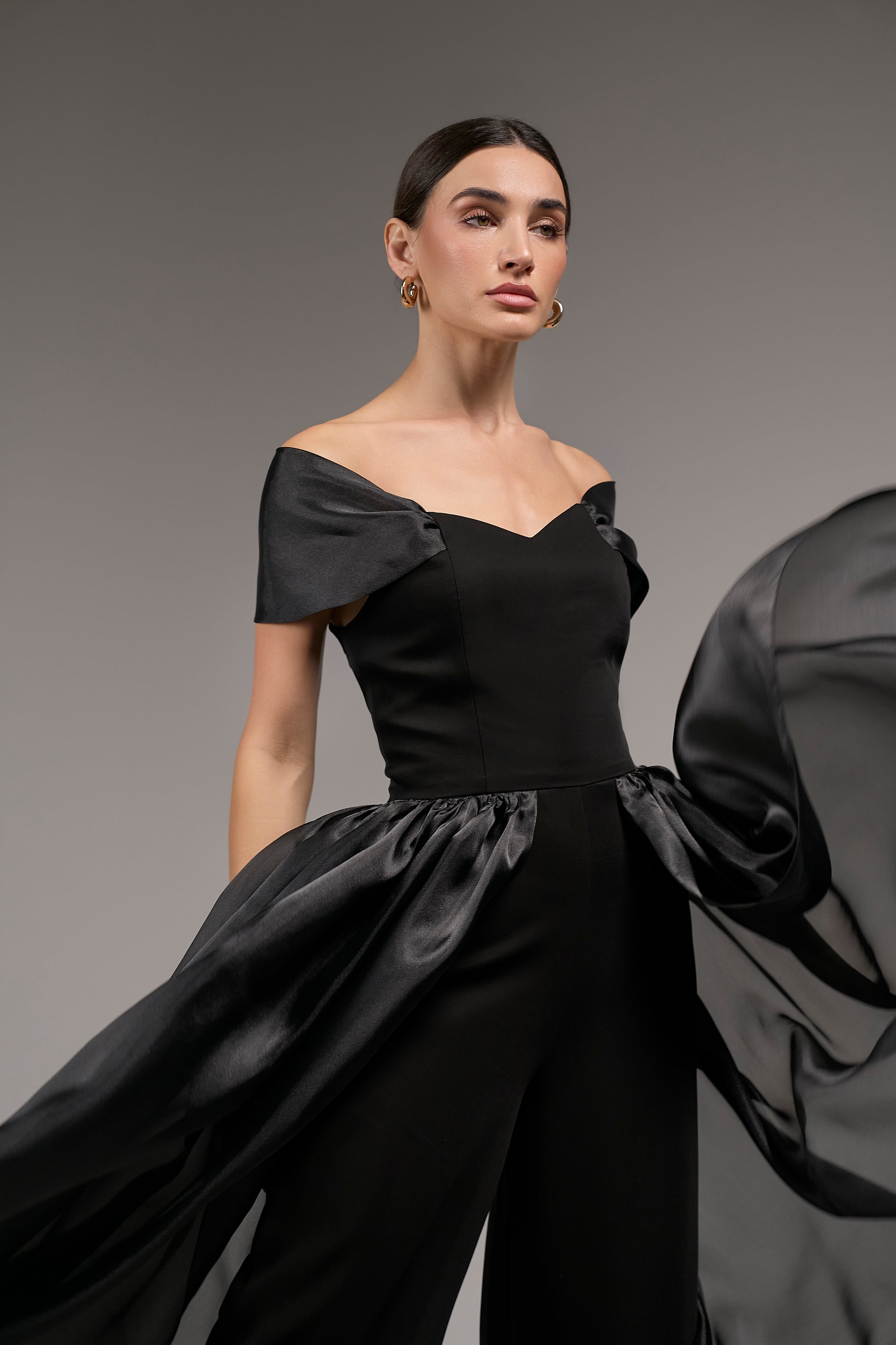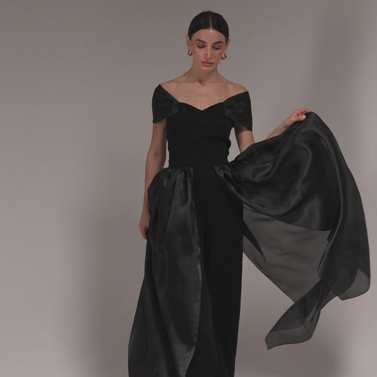 Off-Shoulder Organza Jumpsuit with Side Draping Make a statement with this elegant off-shoulder jumpsuit, featuring flowing organza fabric that drapes gracefully from the side for a dramatic, ethereal effect. The organza sleeves add a delicate, airy touch, perfectly balancing structure with softness. Crafted for both style and comfort, this jumpsuit is ideal for formal events, evening parties, or any occasion where you want to exude sophistication and effortless glamour.